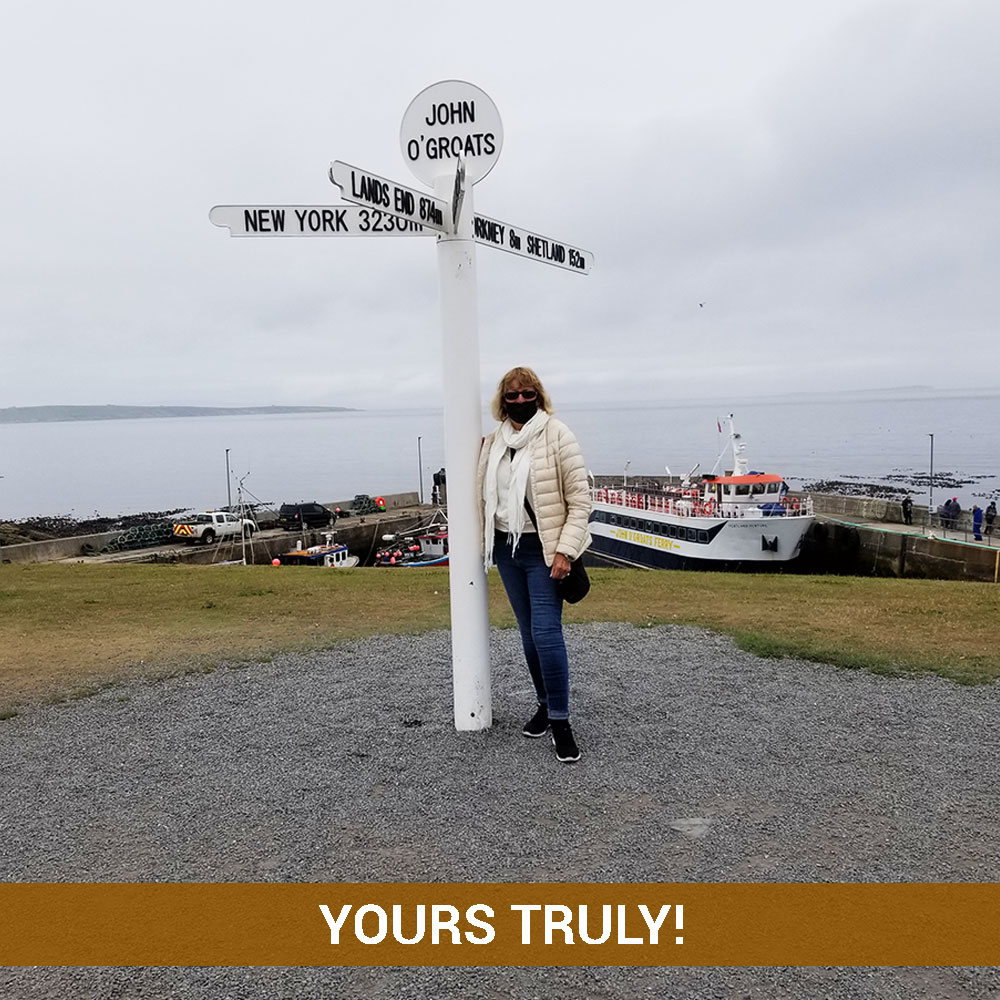I treated myself and took the first class train from London to Inverness, stayed overnight in Inverness and then a 4-and-a-half journey to Wick where I stayed another night at a hotel that reminded me of either Harry Potter or Lord of the Rings; very eccentric, old family-owned Scottish hotel. My friend Heather from Cambridge, who now lives here, picked me up and took me to the tip of John O’Groats.