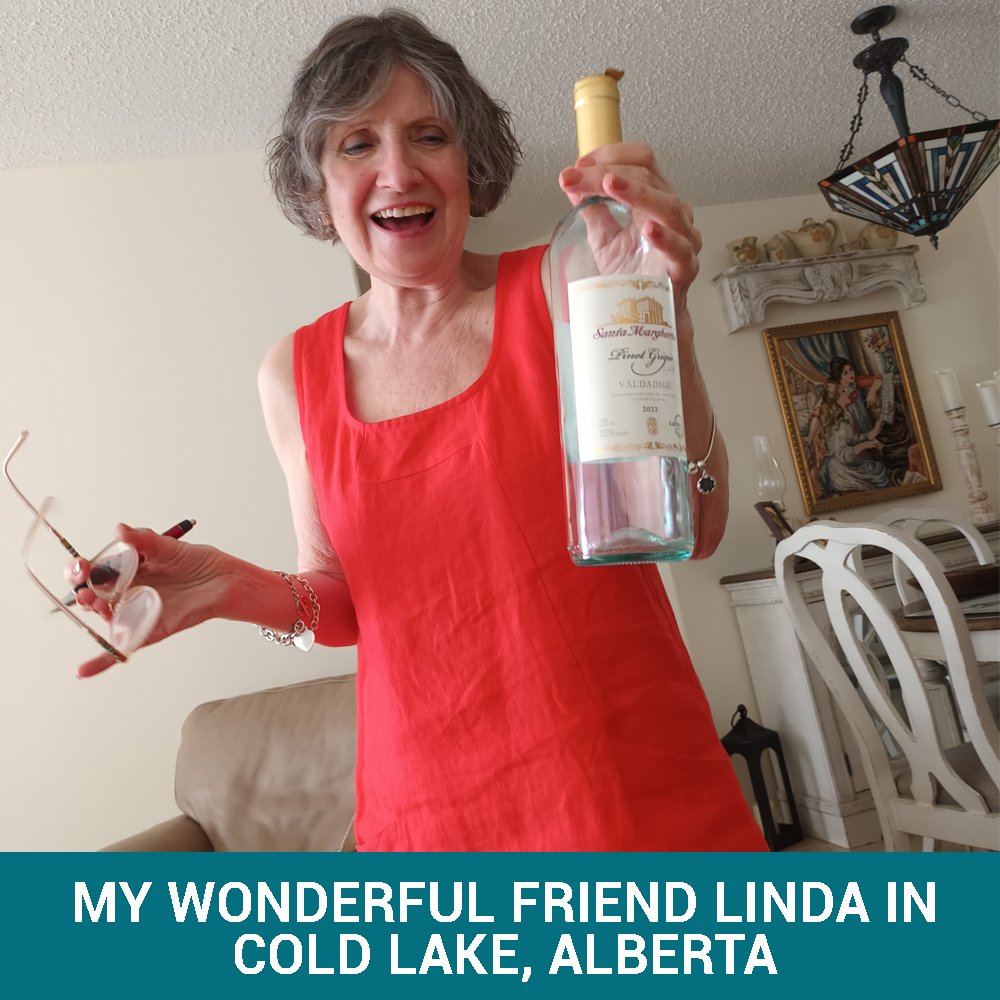Third: I then travelled to Cold Lake, Alberta which is about four hours north of Edmonton, to stay with my old next-door neighbors from Newfoundland, Linda and Frank. They were wonderful hosts, cooking me great meals. They wouldn’t let me help with anything (such lovely friends) …we just hung out! Cold Lake is a very pretty little town with a Canadian army base!