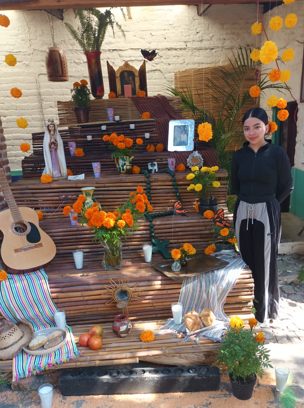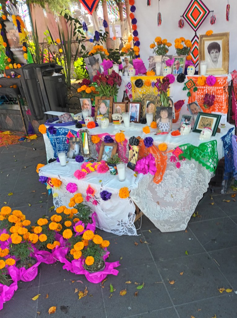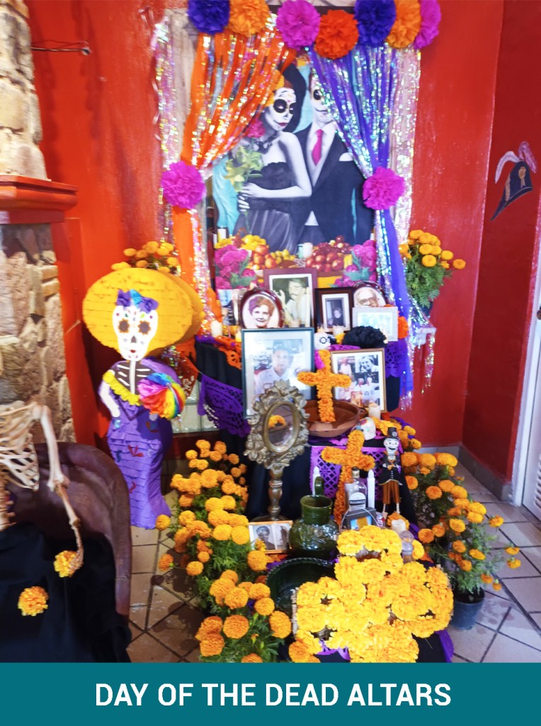Day of the Revolution is a very big holiday here. It lasts well over a week with parades and firecrackers at all hours of the day and night. Another holiday is Day of the Dead (Dios de los Muertes) , which I feel is the best holiday ever! Mexicans honour their Dead in many special ways, such as building altars where they place pictures and even food prefered by their deceased loved ones. Lots of masks and beautiful costumes, and many wear special makeup.